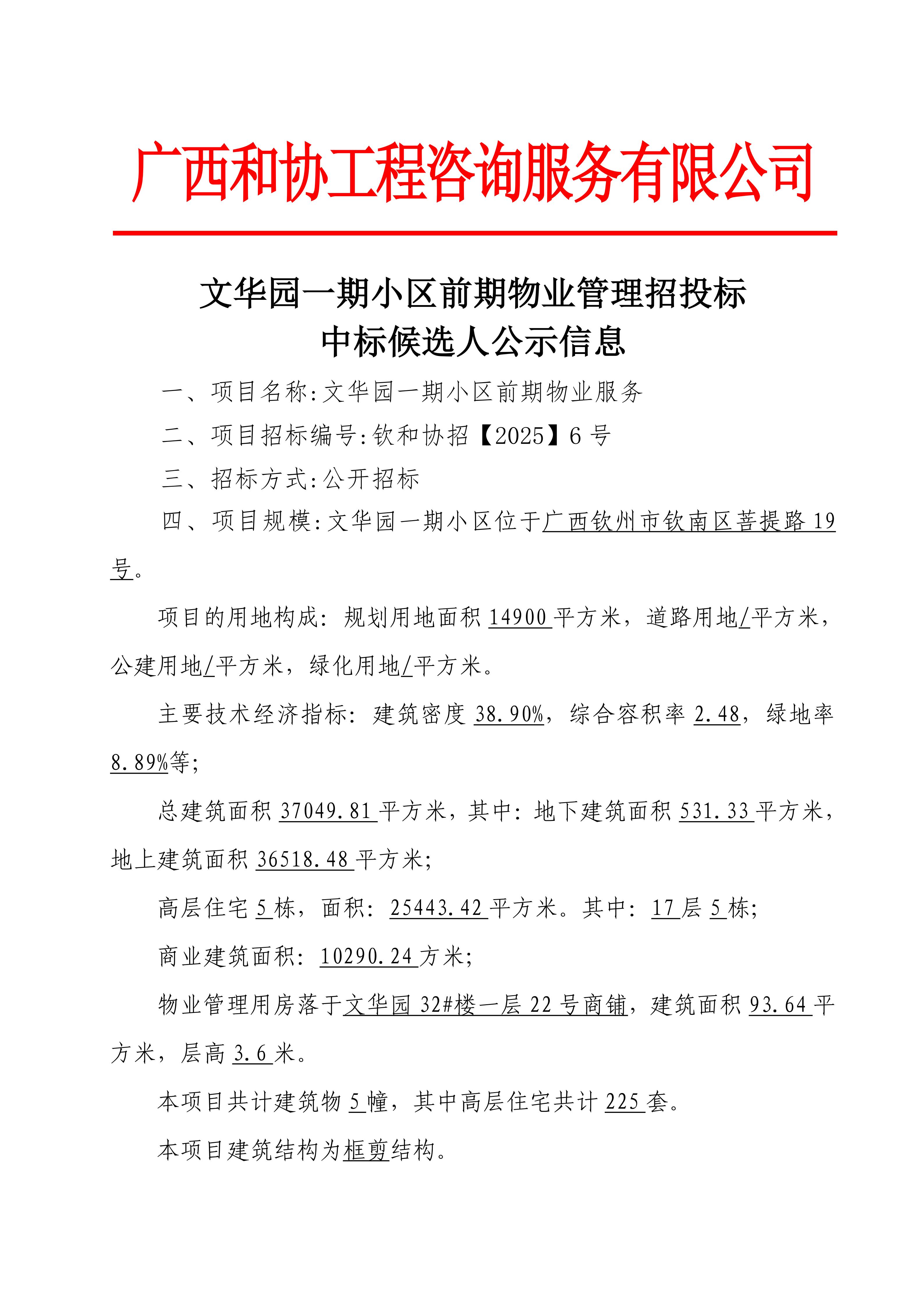 文華園二期小區(qū)前期物業(yè)管理招投標(biāo)中標(biāo)候選人公示信息